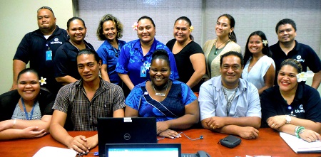 Computer Science Department chairman Ernie Seiuli (front, 2nd right) and Administrative Technician Officer Victor Ualesi (front, 2nd left), both from ASCC, lead a community training session for employees of BlueSky Communications. (Photo: J. Kneubuhl)
