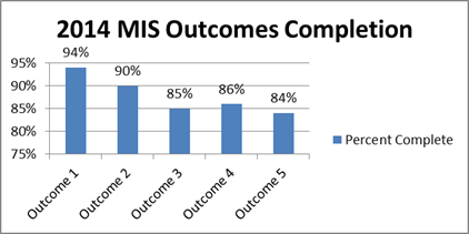 Diagram 1 shows progress made in completing the MIS Outcomes for fiscal year 2013-2014 that was reported in the MIS 4th quarterly report summary.3 According to this, outcomes ranged from 84% - 94% completed. MIS completed most of its outcome objectives in 2014 in efforts to effectively meet the needs of ASCC.