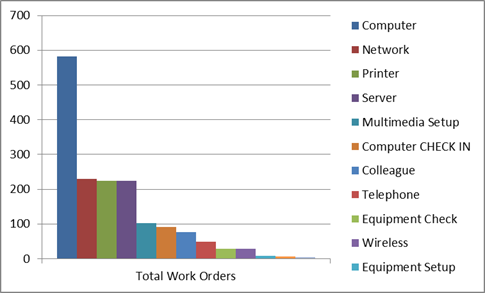 From this report, MIS is able to identify user needs based on the amount of work orders in each type. For example, the report displayed in Diagram 3 shows that in 2014, MIS received the most requests for computer, network and printer support. This report identifies a strong need for technology support, especially in the areas of computers, the network, and printers. This trend has been consistent in previous years. Responding to this, MIS has hired more technicians in the offices that support these three areas. Also steadily increasing recently are requests for server support. MIS has a System Administrator assigned to these work orders, but MIS is monitoring this increase to see if more staff is needed to provide server support.