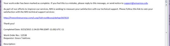 The MIS Division is organized into offices that provide support for different areas of technology for ASCC. These offices are 1) Office of CIO, 2) Network and Multimedia, 3) Helpdesk, 4) Systems Administration, 5) Web and Communications, 6) Website Administration, and 7) Computer Labs. Each office provides technology support to ASCC users either directly by responding to a work order or providing direct assistance, or indirectly by completing projects for the MIS Division to improve MIS services. Technology needs that arise within these offices or by any users supported by these offices are reported to MIS through email, phone or visit to the MIS office. MIS has a support email address (support@amsamoa.edu) that is tied to the Trackit software. A work order is automatically created when a user emails the support address. An email confirmation is also automatically generated and sent to the user, including the work order number, to confirm their request has been received. This process is documented in MIS Standard Operating Procedures for creating a work order request.5