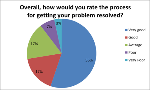 According to Diagram 5, 55 percent of the respondents reported the process for resolving the issue was Very Good, 17 percent reported it was Good, 17 percent reported that it was average, seven percent reported that it was Poor, and three percent reported that it was very poor. The responses collected using this survey shows that users are generally satisfied with the technology support provided by MIS. However, compared to data that was collected prior to this, satisfaction has slightly decreased. Some factors that may have contributed to this are that MIS was short-staffed by two employees for the second half of the year, so completing requests took longer.